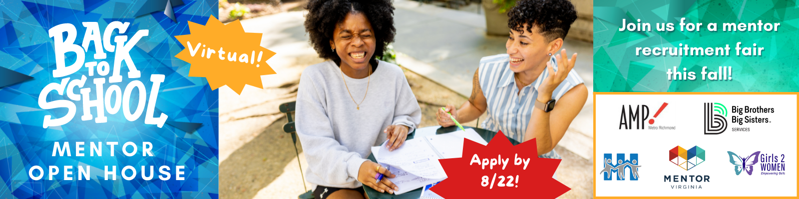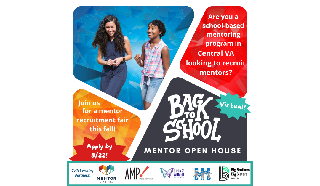 MENTOR Virginia, AMP! Metro Richmond, Big Brothers Big Sisters, Girls2Women-VA, and Henrico HEROES are collaborating to host a mentor recruitment open house for school-based programs in Central Virginia this fall. We’re seeking mentoring programs that wish to participate and recruit mentors for their program!