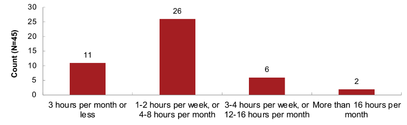 Of the mentoring programs that completed the survey, the vast majority have their matches meeting each other for 1-2 hours per week, or 4-8 hours per month. The second most common dosage was slightly lower dosage than 1-2 hours per week, at 3 hours or less per month. A small handful of programs are having their matches meet more than 12 hours per month, which would be considered a more intensive dosage of mentoring than the average program.