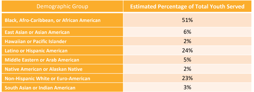 Programs were asked to identify the race and ethnicity demographics of the youth they worked with in 2021. The largest demographic group that was served by mentoring programs that completed the survey were Black, Afro-Caribbean, and African American youth. The second largest demographic group that benefitted from these mentoring programs were Latino or Hispanic youth who represent a quarter of youth served by these programs in 2021.