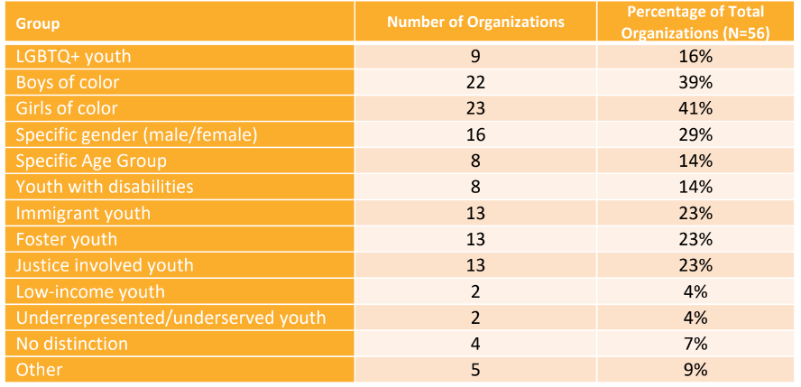 Mentoring organizations that completed the survey were asked to share whether there are specific communities or groups that their programs are designed to serve. While many respondents shared that they do serve specific communities, 8 respondents shared that they do not have specifications around who can be connected to a mentor.