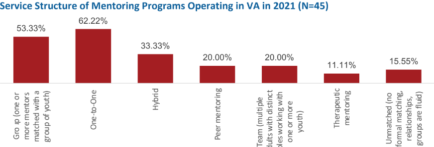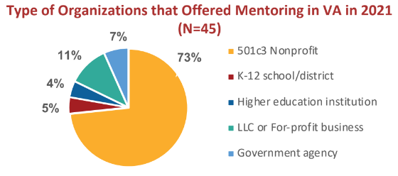 Of the 56 respondents only 45 represented organizations ran active mentoring programs in 2021. The data below is only representative of the 45 mentoring programs that completed the survey, and is not intended to be considered a comprehensive report on all the mentoring programs operating in Virginia.